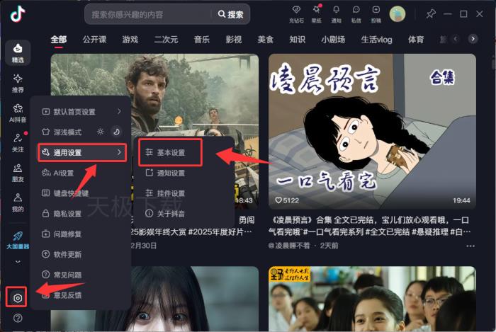 1.打开抖音电脑版,点击左下角的【设置】,选择【通用设置】-【基本设置】。