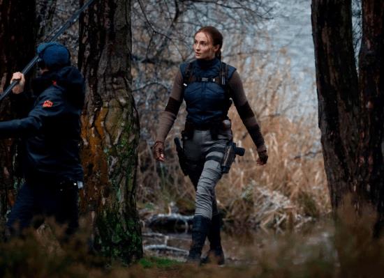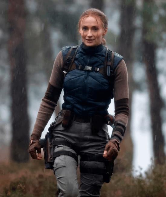 画面中,索菲·特纳饰演的劳拉现身一片雨林环境,在淅淅沥沥的雨中缓步前行。她身穿长袖长裤、战术背心,腰间配备双枪枪套,并梳着极具辨识度的经典长马尾辫。