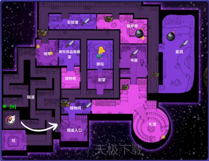 地下室设有多处藏身处,可供鸭子阵营、工程师及鸽子进入。角色进入藏身处后,可在隐蔽状态下观察其他玩家的行动轨迹,为阵营战术执行提供信息支持。