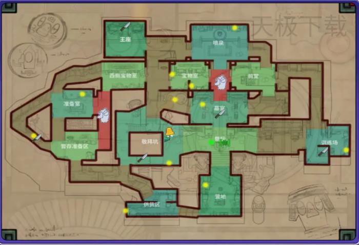 ●训练场:触发后地图上对应的门会封闭一段时间,期间会阻断特定区域的出入。关门时还可能根据玩家身位,将门口的玩家封到门内或外,进而形成局部孤立的局面,方便鸭阵营针对性下手。