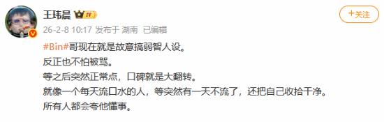 不久之后,知名电竞博主、消息人士@王玮晨 发微博解释了Bin哥这一“抽象”行为,称在他看来,Bin哥其实是“故意搞弱智人设”,等后面人正常了,就是“口碑大翻转”。