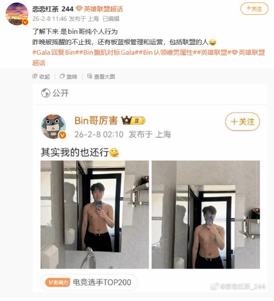 除此之外,另一位电竞圈消息人士@恋恋红茶_244 也发文表示这是Bin哥“纯个人行为”,管理层并不知情。