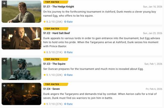 目前,权游系列的最高分纪录由《卡斯特梅的雨季》(“红色婚礼”)、《私生子之战》和《凛冬的寒风》三集保持,均为9.9分。此次《七王国的骑士》第四集(标题为“七”)凭借其高潮的“七子审判”团战、角色弧光的收束以及令人振奋的情节转折(如贝勒·坦格利安的驰援),赢得了观众近乎完美的认可。