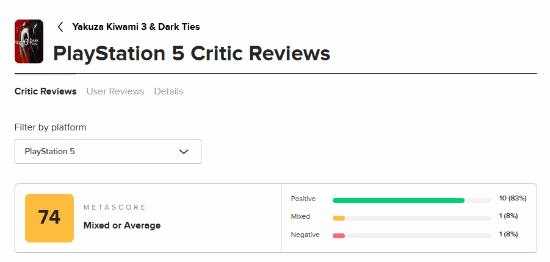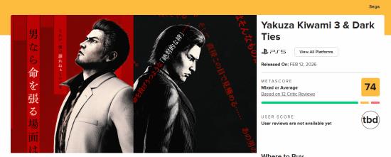《如龙:极3/如龙3外传Dark Ties》媒体评分解禁,M站均分74分,已有10家媒体打出好评,1家给中评,还有1家给了差评,游戏定档2月12日发售。
