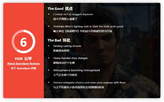今天,外媒GameSpot发布了《如龙:极3》的评测,只给了6分,原因是过渡氛围不够,缺少亮点。