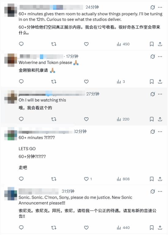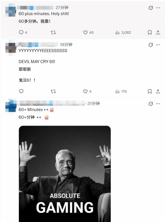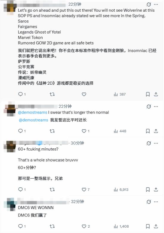从玩家讨论来看,不少人将目光聚焦于多款备受期待的作品:有玩家高呼 “DEVIL MAY CRY 6!!!”,期待《鬼泣 6》的相关情报;也有玩家呼吁希望看到《漫威金刚狼》的实机演示;还有玩家猜测《最后生还者》系列新作或将公布。不少玩家对超 60 分钟的直播时长感到兴奋,认为这意味着会有更多重磅内容公布。
