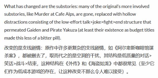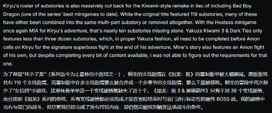 WccfTech的评测报告给出了详细数字,他们是这样介绍的:“原作中一共包含119个支线任务,而在本作中,其中不少要么被合并进同一个多章节支线,要么被彻底删除。(……)《如龙:极3/外传Dark Ties》的支线总数甚至不足36个……”