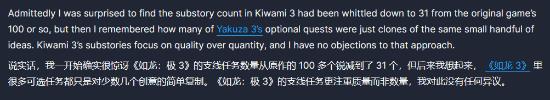 不过,这个数字和IGN的描述有些出入,IGN在评测中介绍称:“说实话,发现《如龙:极3》的支线数量从原作大约100个被压缩到只剩31个时,我确实有些吃惊。”