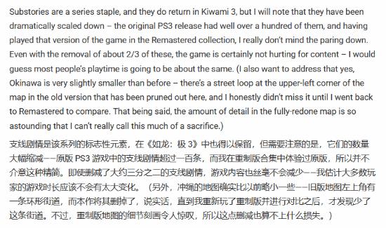 考虑到除了对原版《如龙3》的重制,本作还有“外传”部分作为补充,因此这样的删减或许并不会对整体游玩时长产生明显的影响,Noisy Pixel在评测中表示:“即便删掉了大约三分之二的这些内容,游戏在内容量上依然谈不上匮乏——我估计大多数玩家的整体游玩时长其实不会有太大变化。”