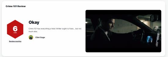 今天IGN给《犯罪101》打了个六分,评价这部片有点套路化。说是抢劫电影的入门课,还不错。导演巴特·莱顿和主演克里斯·海姆斯沃斯、哈莉·贝瑞、马克·鲁法洛努力往老套的犯罪惊悚片里加点新东西,但还是没跳出那框框。虽然这片子可以当个类型基础课来学,但问题是,观众是不是愿意认真学呢。