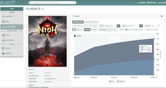 据外媒报道,动作游戏《仁王3》发布短短四天,就在PS5和PC平台售出了超过70万份,Alinea Analytics分析显示,截止到2月10日,这款游戏的总收入已经超过5000万美元,中国玩家贡献不少。
