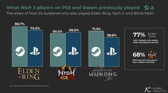 数据还显示,超过80%的《仁王 3》PC玩家玩过《艾尔登法环》,约71.3%的steam玩家玩过《黑神话:悟空》。
