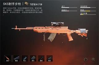 4、SKS:使用 7.62mm 子弹,是半自动射手步枪,非常依赖配件,满配后是最稳定的射手步枪之一,适合新手玩家练习连狙技巧,在中远距离能对敌人造成持续的伤害。