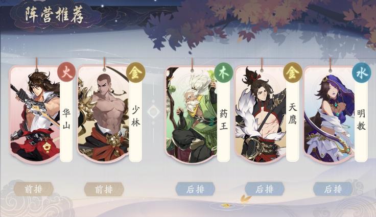 这套阵容前期很容易成型,药王、华山、少林推关或者活动都有送,能凑个4属性羁绊,并且少林、药王作为万金油辅助,能够为队伍提供群体护盾和高续航,提升队伍的站场能力,明教、华山的切后排能力都非常强悍,配合少林、药王的绝技切后排效率也很高,天鹰能弥补队伍的远程输出能力,队伍的输出类型非常全面,是一套兼顾回复、输出、切后、正面抗压和战斗齐全的万能阵容。