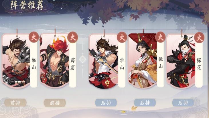 火势力的强力阵容,恒山能够为队伍侠客提供高额的伤害减免,提升队伍整体的硬度,而梁山、霹雳都是火系大侠里“能扛能打”的典范,在自身硬度足够的同时还有高额的输出伤害,配合恒山战斗力和坦度都拉满,再加上华山、探花的高额爆发能力,能够短时间内集火瞬秒敌方后排,融化敌方C位,同时也很难第一时间被秒,输出类型也是多样化的,让敌人防不胜防。