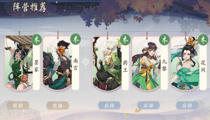 木势力的最强阵容,花间、药王都是全能型的强力辅助,能为队伍提供可观的续航和显著的输出强化,墨家作为前排,不仅扛伤害能力较强,其炮塔的持续输出能力也是不俗,配合药王、花间不仅站场持久,输出还高,而南宫是反制敌方高爆发侠客的最好选择,在被高爆发击杀时,基本上都能换掉敌方一个侠客,远程C位核心九黎绝技不仅拥有着高额全屏范围伤害,还提供短暂的控制,帮助前排更好的站场,自己也有良好的输出环境,整体阵容攻防属性拉满。