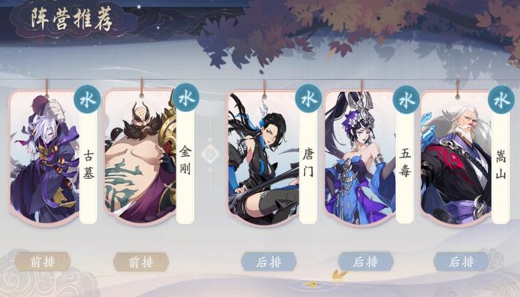 水势力的强力阵容,队伍虽然没有出色的辅助,但是战斗力却非常强,嵩山作为队伍的核心具有很强的控制能力,而且配合上自己超强的自保能力,能够保证稳定的控制,给其它两位核心C位五毒、唐门提供良好的收割环境,并且五毒、唐门都是全屏性的范围攻击,3C配合起来有很好的收割效果,另外,前排古墓能够召唤毒人吸收伤害,金刚也有高强度吸收伤害能力并且还能反击,能确保后排大厨和稳定的控制和输出,整体阵容协调性非常强。