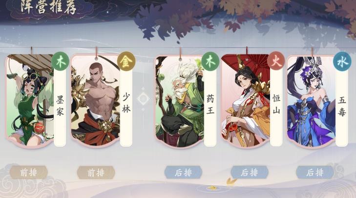 四系侠客组合的最强阵容,能激活4属性羁绊,五毒作为队伍核心,本身绝技“吸血”的机制就能有不错的持续输出能力,机制上的续航拉满,再加上少林提供的群体护盾、药王提供的群体治疗、恒山提供的群体伤害减免,能够将五毒的持续输出能力拉满,同理,墨家作为前排坦克里少有的站场输出型定位,扛伤能力和输出能力都能得到极大的提升,整体阵容就是主打极致的持续输出能力与站场能力,防御滴水不漏且能有稳定的输出。