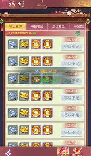 玩家点击右边的福利,即可看到等级礼包,玩家每提升十级就可以获得一个礼包,内含大量的绑元和进阶丹奖励。