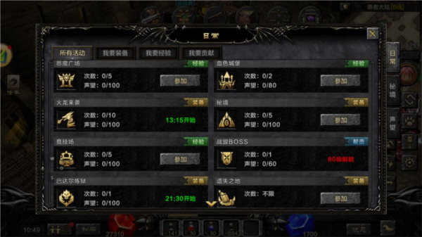 2. 日常活动: 每日参与恶魔广场、血色城堡、竞技场和赤色战场等,这些活动在特定时间开放,提供丰富经验和奖励。