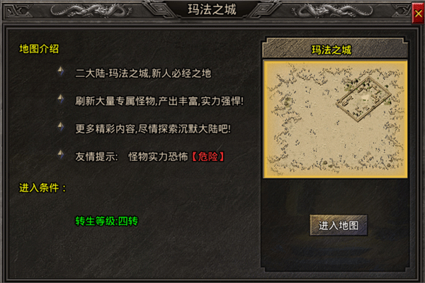 3、转生完成四转后将会提示你进入第二大陆-玛法之城,是新人必经之地,可以获取玛法专属的神器装备。