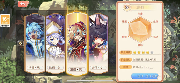 法师和游侠属于进阶职业,法师的输出强度是满的,而游侠则爆发更高,相比之下游侠的操作难度会更高一些。所以根据自己的喜好来选择,如果之前没玩过横版动作游戏,推荐近战,否则就选择远程职业,有着更高的上限。