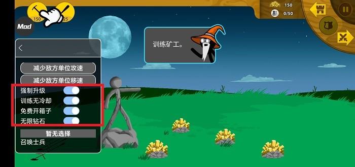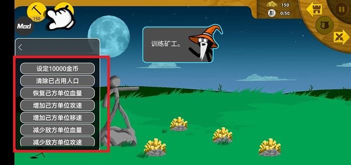 火柴人战争遗产游戏菜单功能介绍1、增加1000金币;