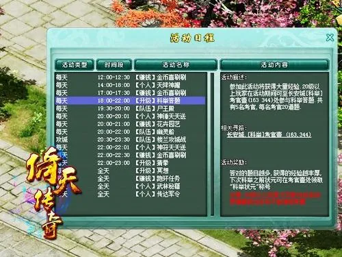 3、日常活动:很多人玩游戏喜欢越级打怪,得到的经验也确实很可观。但相对付出的成本,如药品,装备耐久等也十分令人心疼。在《倚天传奇》中,过了长安边境所遇到的怪均为主动怪,如果实力未足够强大,着实生存不易。但《倚天传奇》的日常活动主要集中在长安城内,不用担心生命安全,做做活动就可以拿到大把经验,那又何乐而不为呢?“科举答题”、“猜拳”等活动也有着极大的趣味性,不会令人觉着无聊。