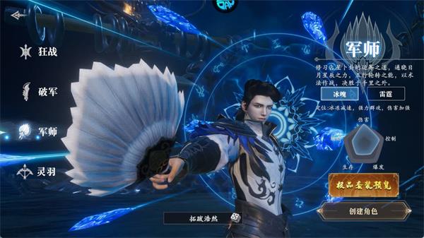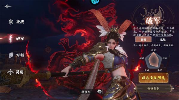 4、高自由度品格培养:四大职业——狂战、破军、谋士、灵羽——可以自由切换。技能天赋树经过深度定制,以确定战斗风格。