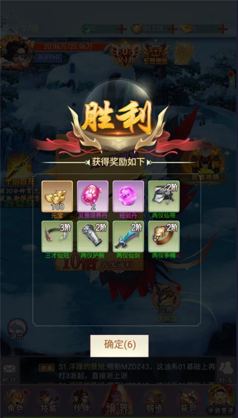 3、击败boss后考验获得闯关资源、装备奖励。