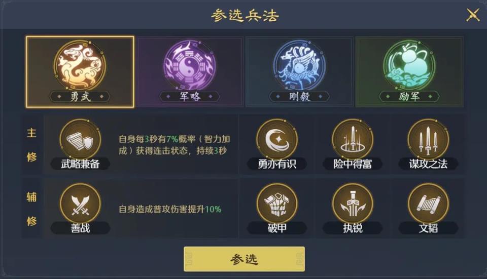 兵法系统的养成也很简单,我们先选择兵法派系方向(从勇武、军略、刚毅、励军中4选1),然后用20点领悟点(分解紫色信物获得)去激活主修兵法。