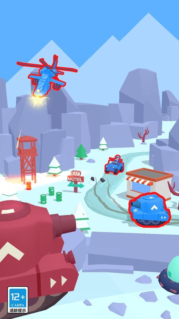 收集与升级:击败敌人获取资源,用于升级坦克各项属性(攻击、防御、速度)和解锁装备,如不同威力的特种炮弹。