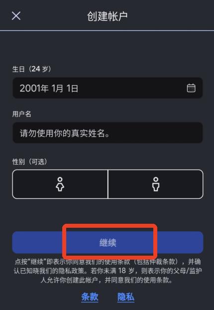 2、输入你的生日、用户名、密码和性别,然后点击下方的【继续】。建议年龄设置偏大一些,名字用英文。