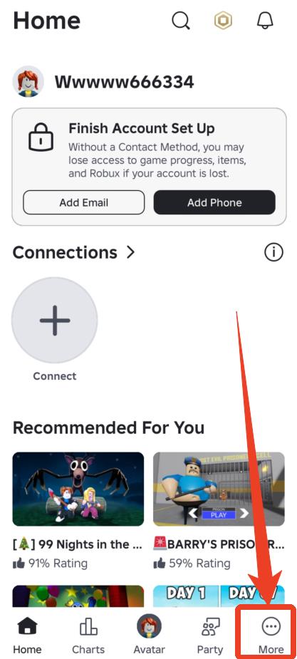 roblox游戏怎么设置中文1、登录进去之后点击右下角的【more】,前往更多页面。