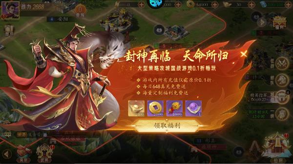 进入游戏后,第一时间领取主界面【封神再临·天命所归】活动中的0.1折福利。可获得大量元宝、铜钱等基础资源,为前期抽卡与阵容培养打下坚实基础,务必不要错过。