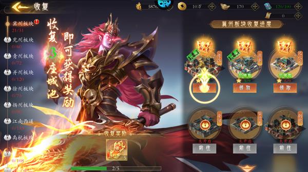 通过收复系统逐步收复冀州板块城池,每收复3座城池即可领取阶段奖励。不仅能持续获取大量资源,还能解锁更高等级的玩法与专属福利,是中前期提升战力的重要手段。