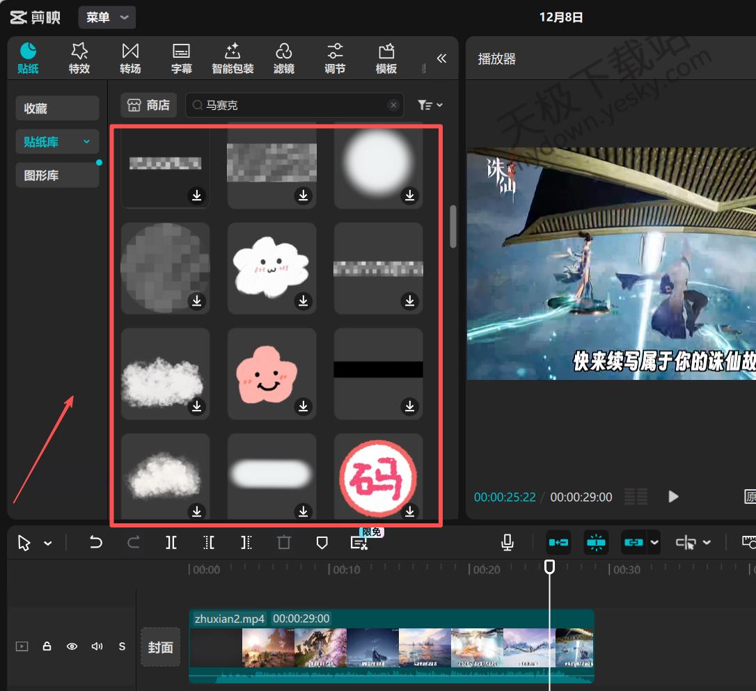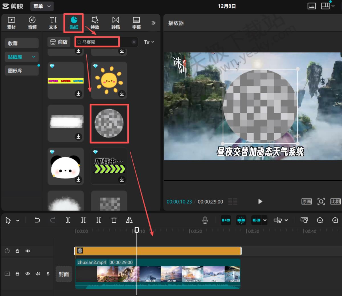 2.点击左上角【贴纸】选项,搜索【马赛克】,找到适合的马赛克贴纸添加,然后在轨道上方将其覆盖整个视频轨道。