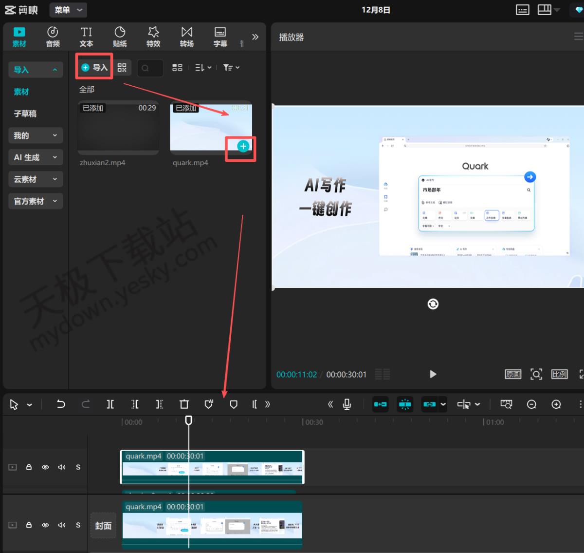 1.下载并打开最新版本的剪映,点击上方【导入】,添加视频素材,然后将其中一段加到轨道上。