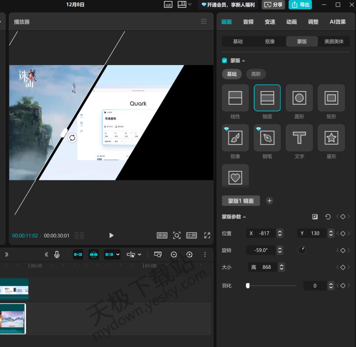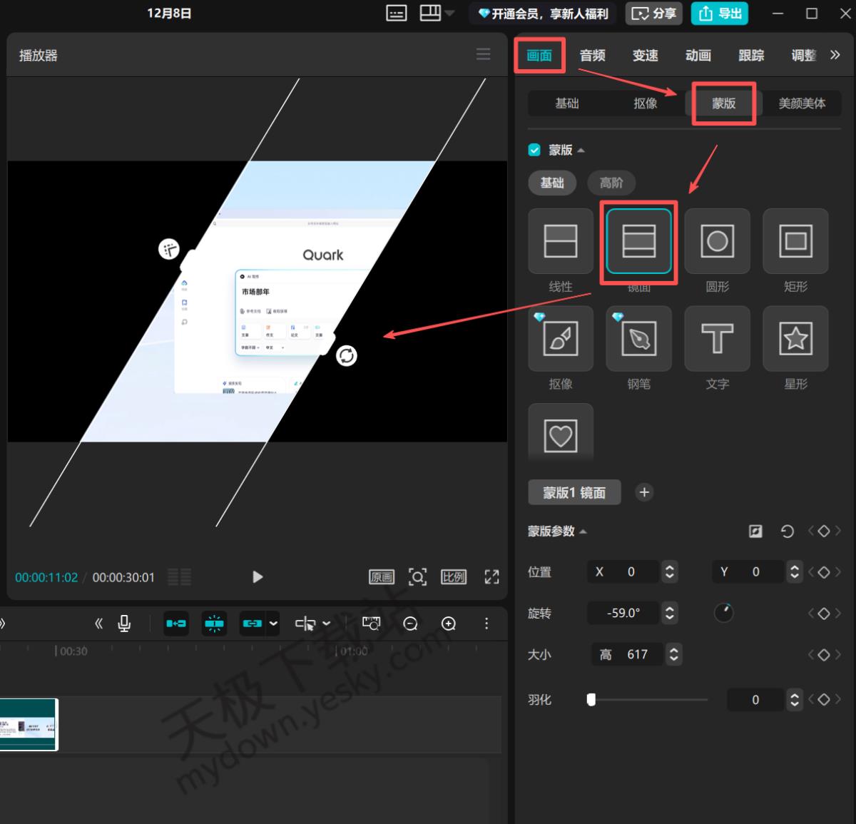 2.选中轨道视频,点击右侧【画面】-【蒙版】,选择需要的蒙版效果,然后手动调整蒙版的角度和比例。