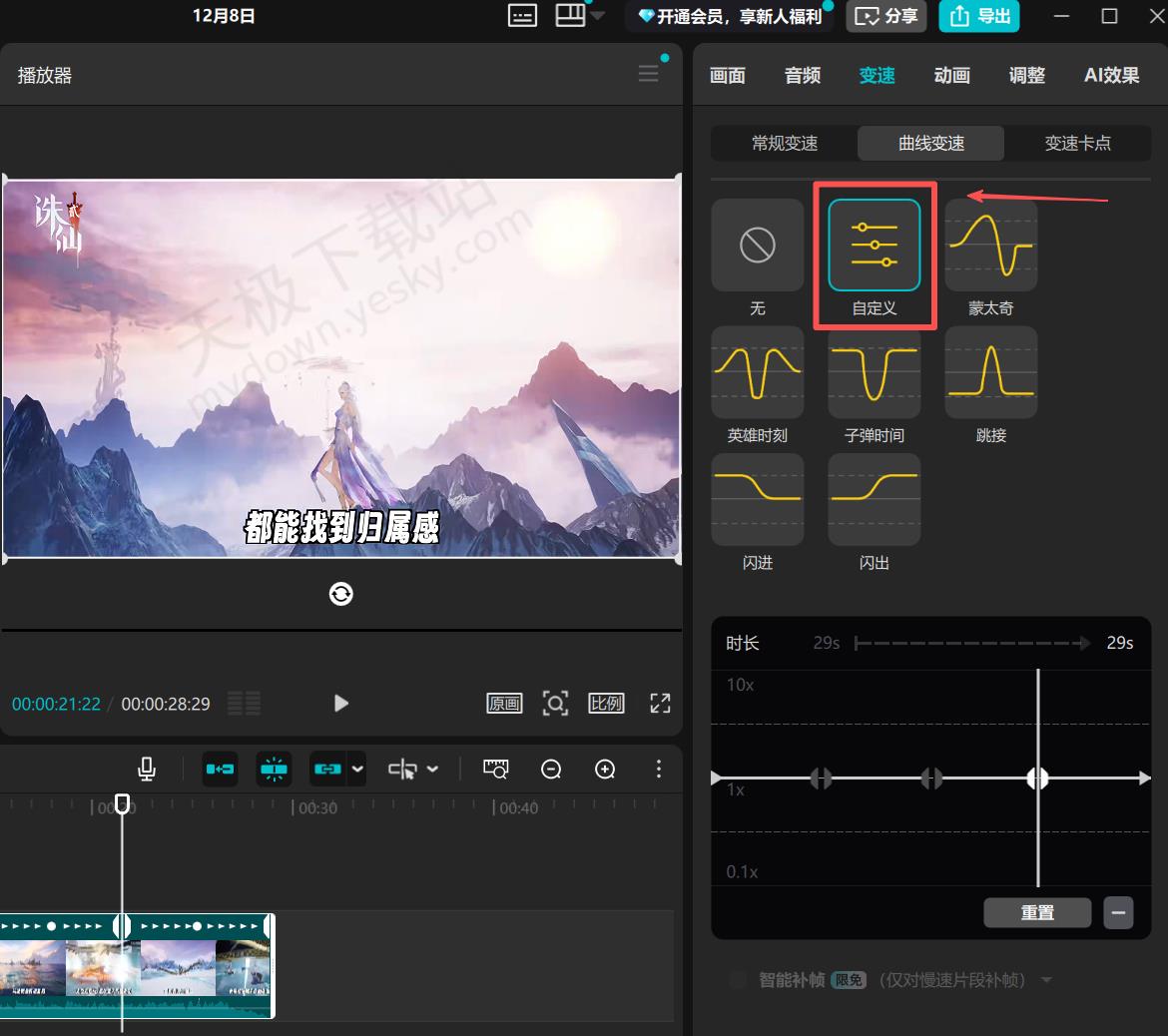 ●在变速面板选择【自定义变速】,下方会出现自定义变速面板。