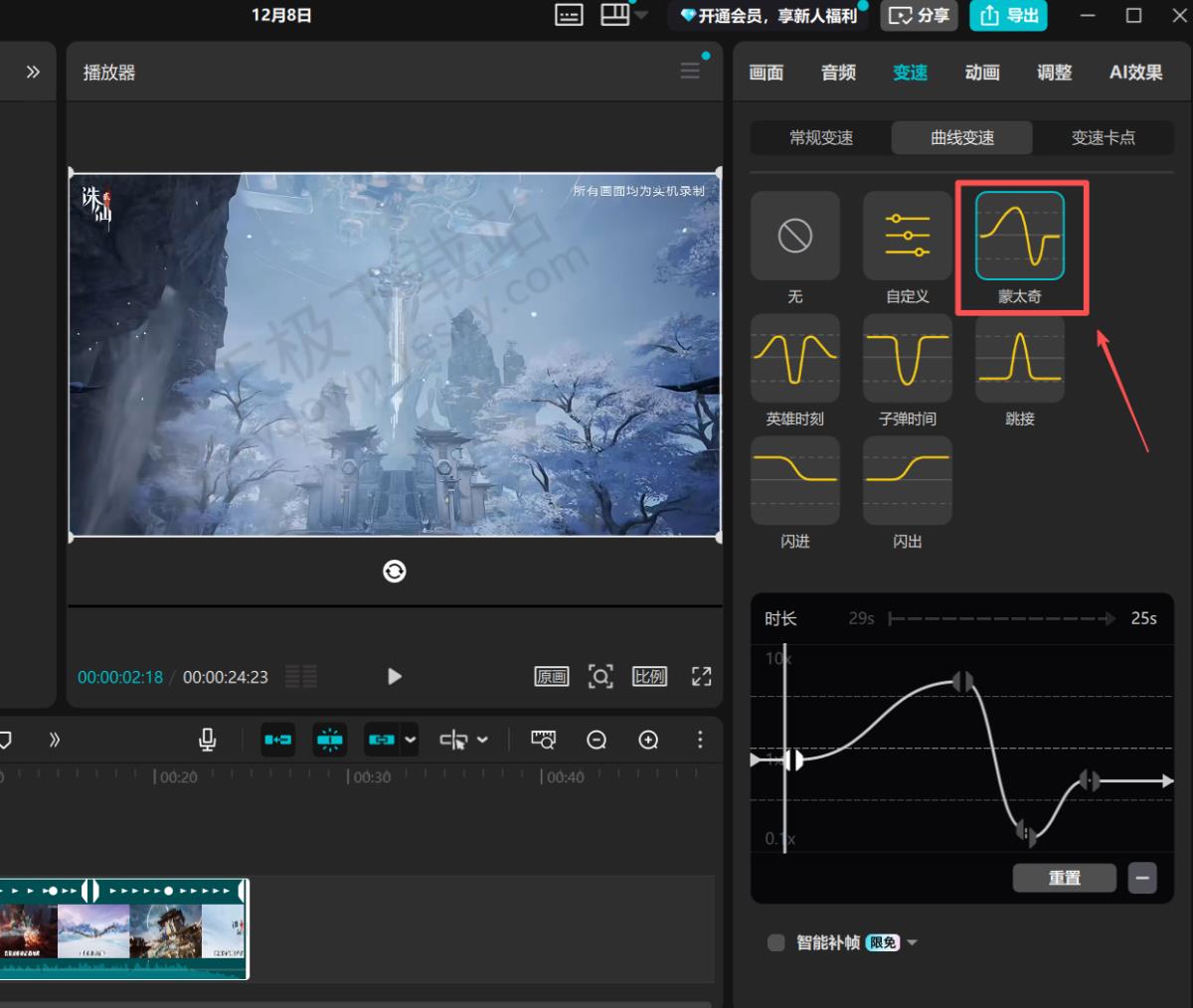 ●在【曲线变速】处,还有多种变速模板,它们都拥有各自固定的变速方案,选中后可在视频轨道处进行调整。