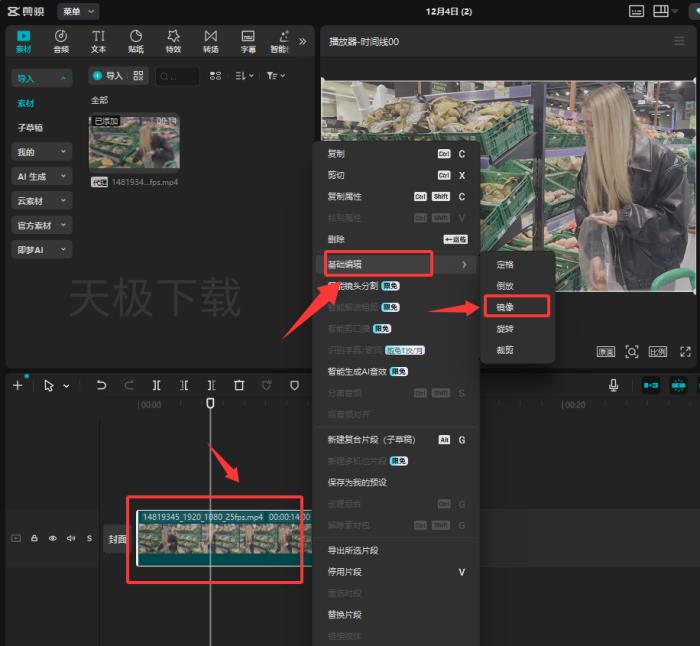 2.右键时间轴上的视频素材,点击【基础编辑】-【镜像】。