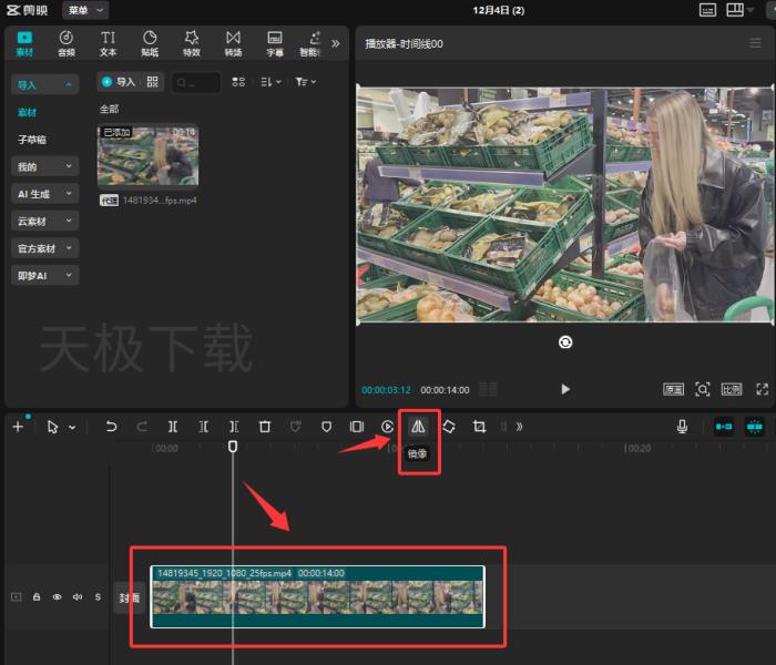 3.也可以直接选中时间轴上的视频素材,点击上方功能栏中的【镜像】功能。