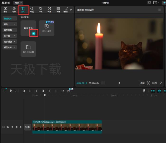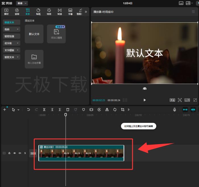 2.添加其他素材,例如文字、音频、贴纸等,这边以文字为例,点击上方标签的【文本】,点击【默认文本】添加到时间轴。