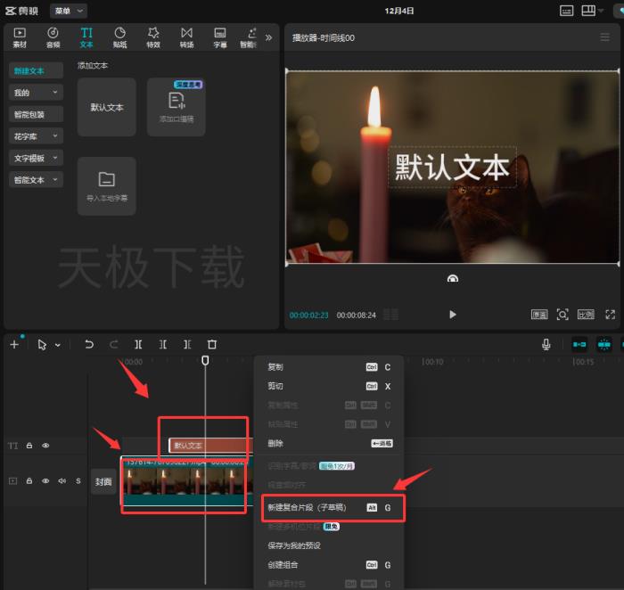 3.同时选中视频素材和文本素材,【右键】-【新建复合片段(子草稿)】,也可以直接按快捷键【Alt G】快速新建复合片段。