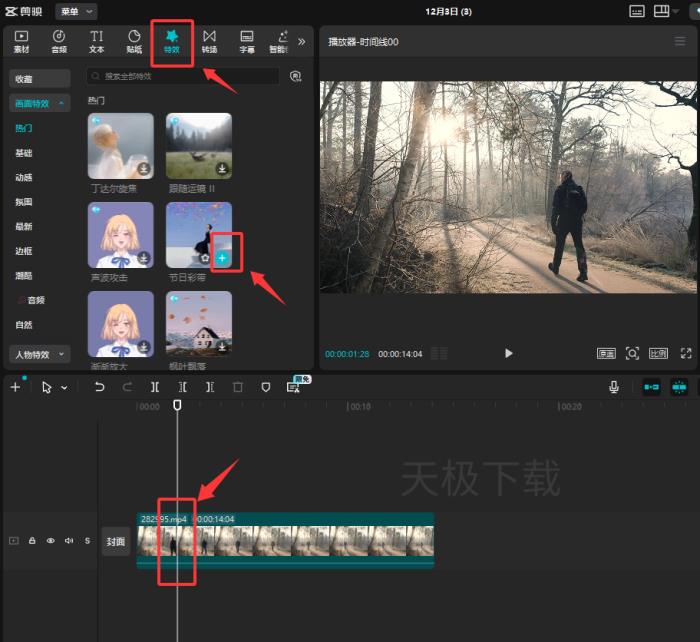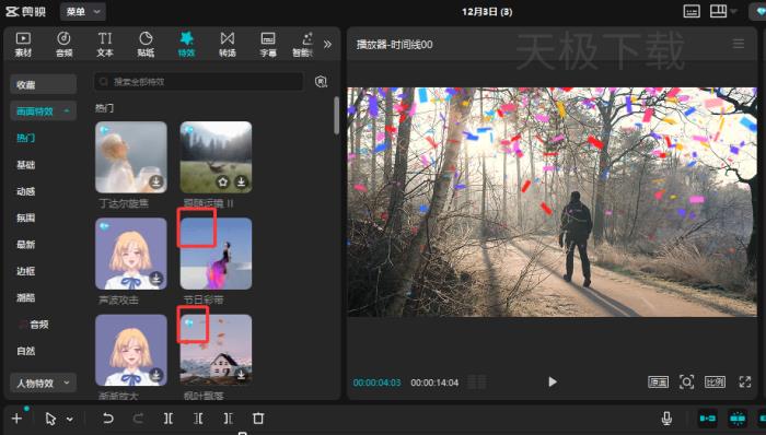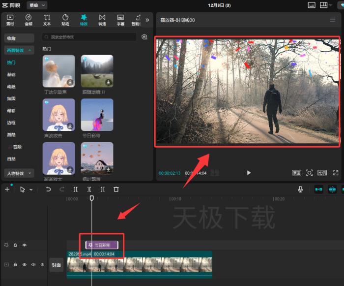 2.将指针定位到需要做特效的时间轴,点击上方的【特效】,选择合适的特效效果,例如【节日彩带】,点击右下角的【 】键。