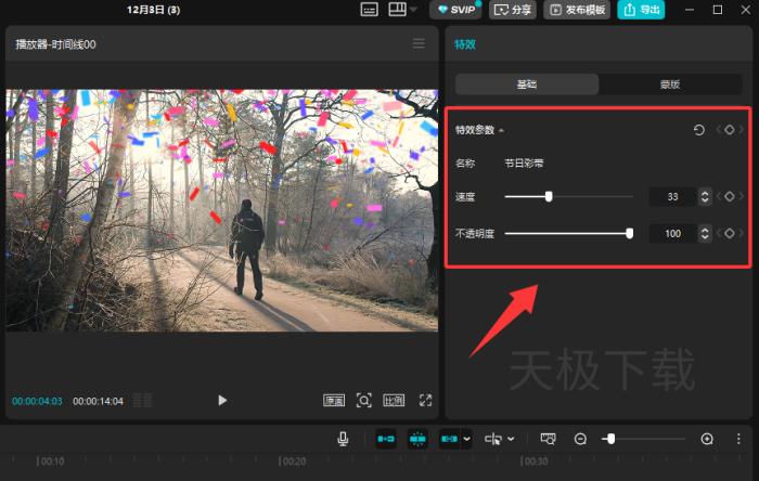 4.在右侧菜单中,可以对特效的速度、不透明度等参数进行调整。