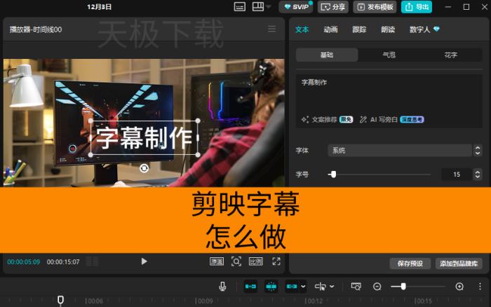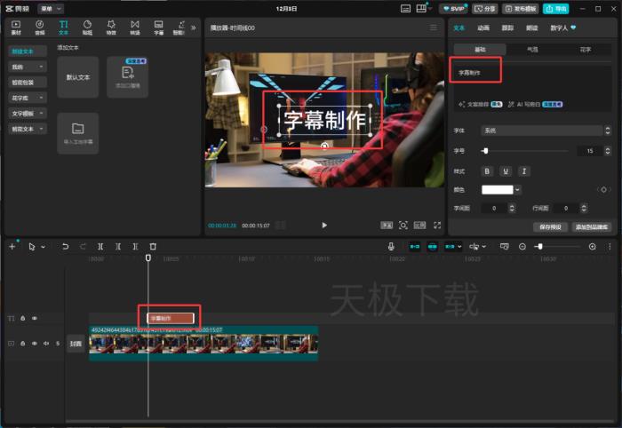 3.添加完成后,时间轴上方会出现字幕条,同时右上角可以输入字幕内容,预览框会实时显示字幕效果。