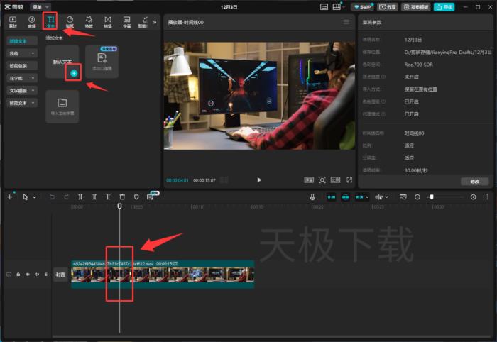 2.将指针定位到需要制作字幕的时间轴,点击上方的【文本】,点击【默认文本】右下角的【 】键。