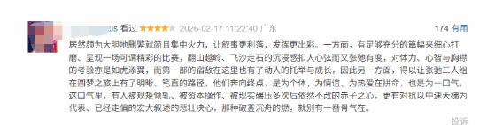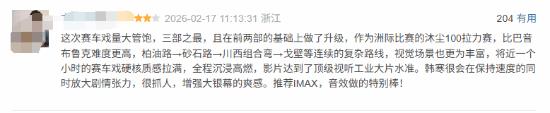 给出好评的观众认为,《飞驰人生3》是目前系列最佳之作,是一部更加纯粹的赛车电影。文戏部分精炼克制,讽刺表达依然犀利;赛车戏份占比大幅提升,镜头调度更具冲击力,全程节奏高燃,还加入了“人与AI对抗”的设定,带来新的看点。不少观众直言,这一部的赛车场面“量大管饱”,无论规模还是呈现方式,都是三部曲之最,并在前作基础上完成升级。